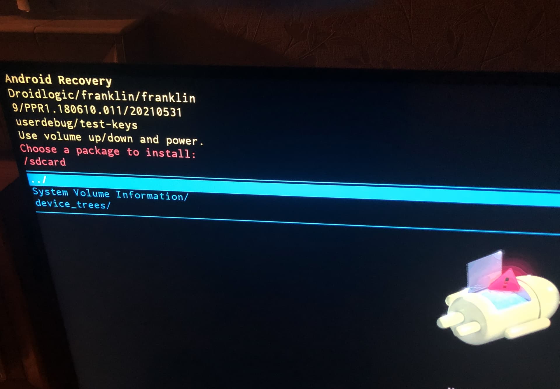 same result - would not boot - went to android recovery screen - navigated to “choose a package to install” - and to “sd card” - just to see if there was anything different to be seen (there wasn’t)- but to exit i used the back button on the remote